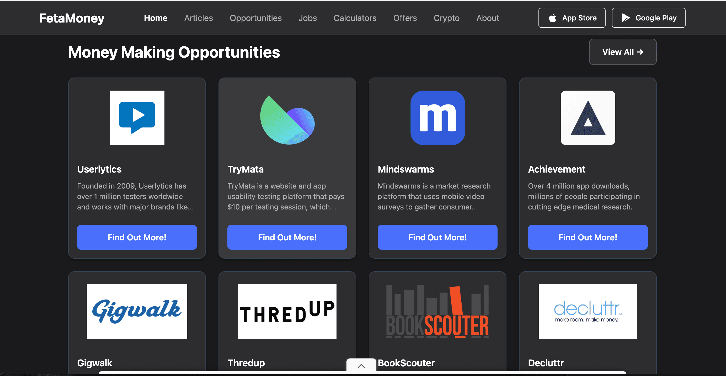 Feta helps you build streams of passive income through simple online methods. Learn proven strategies, discover new side hustles, and track your earnings—all in one easy-to-use app.