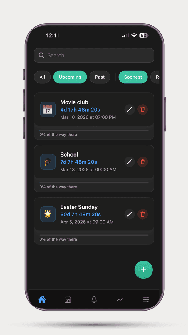A beautiful and intuitive countdown timer app that helps you track important events, deadlines, and special moments with customizable timers and elegant design.