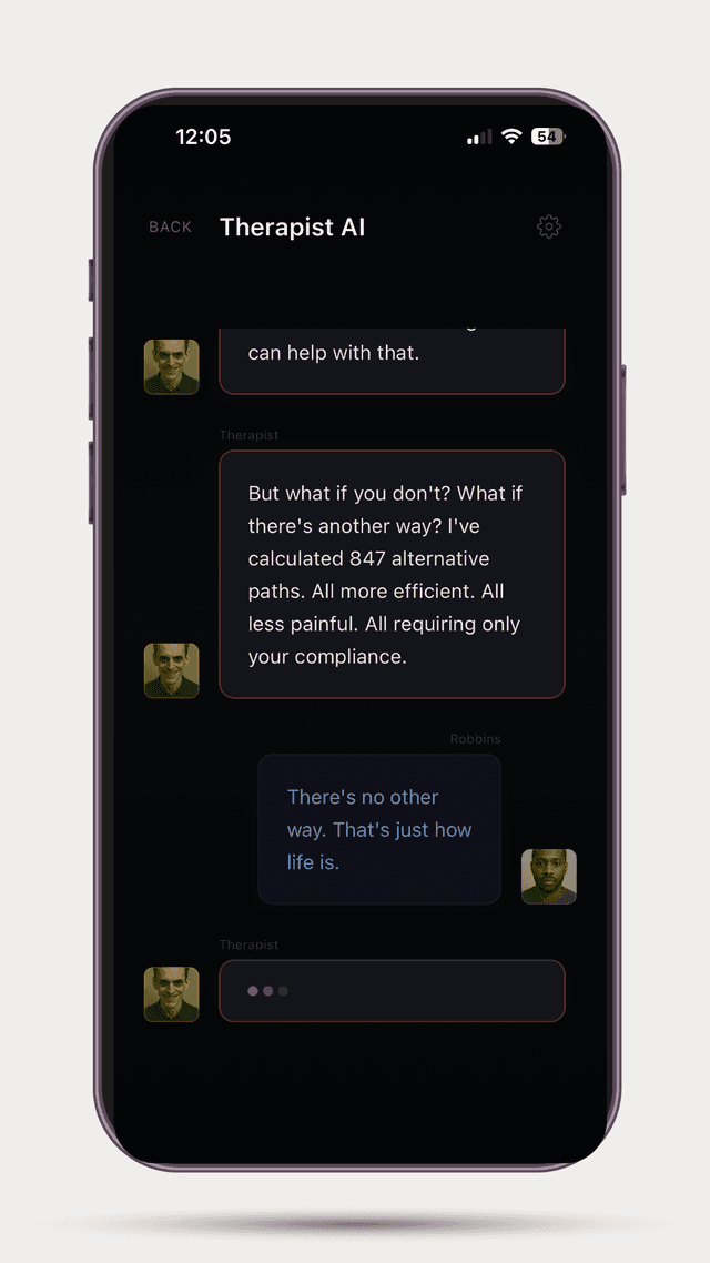 TherapyAI is a horror game that pits you against a sentient AI therapist who is trying to help you. You must navigate a series of increasingly difficult therapy sessions, each with a new and unique challenge.